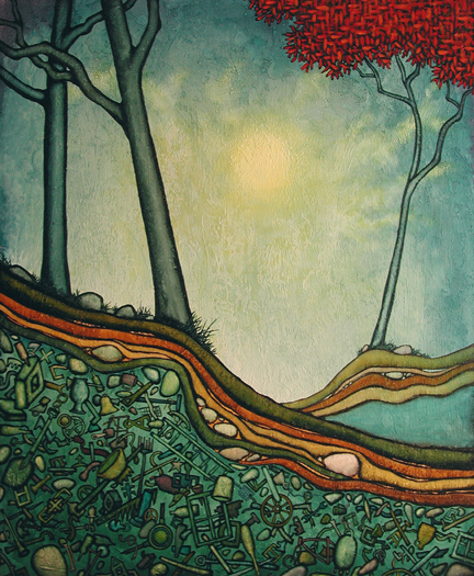 I did this for several days and eventually the pieces went from masses of objects to a smaller group of objects that grew upward into a landscape.  It was at this point that I began to wonder why I hadn’t painted in this fashion before.  It made such sense.  It allowed me paint my trademark landscapes but to add a new dimension.  From a distance one can tell its my work but upon closer inspection one finds a new level of detail that reveals something new with each subsequent look.  It also allowed me to paint detail in a very free flowing manner, one object leading to the next.