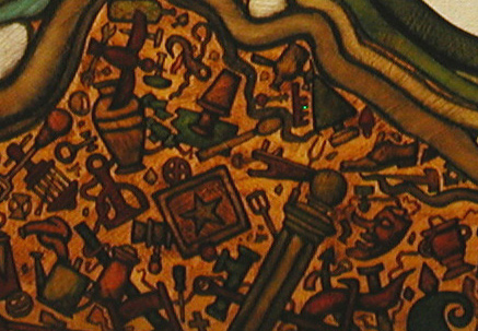 There was also the opportunity to create a new vocabulary with the repetition of objects within the context of my paintings.  There are a number of objects that make appearances in all or most of the paintings of this series.  Peace symbols, shoes, bottles, the letter “G”, etc.