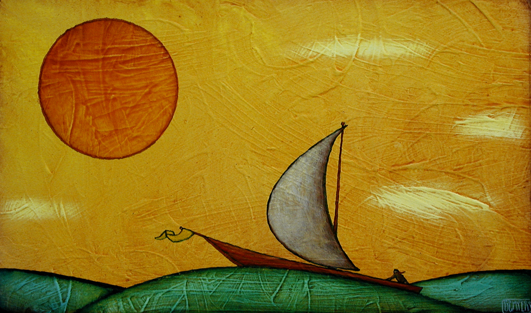 I do a few paintings every year that have a boat riding the waves. They’re simple compositions and are done mainly for my own self-satisfaction. I really like working on simple constructs such as this because it’s such a wonderful challenge to create emotion and depth with only a few elements. It forces one to focus on the more subtle aspects of the painting– the quality and depth of color, the delicate interaction of the compositional elements, the way the underlying texture creates tension and motion above, etc.