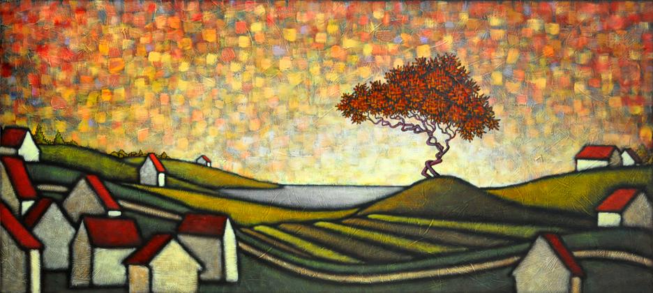 This is the painting I wrote of last week when I wrote about my new work for this new year (Differing Technique– January 5 post) and the similarities of it to my Red Roof series from several years back. This is the larger piece I was working on at the time, a 24″ by 48″ birch panel.