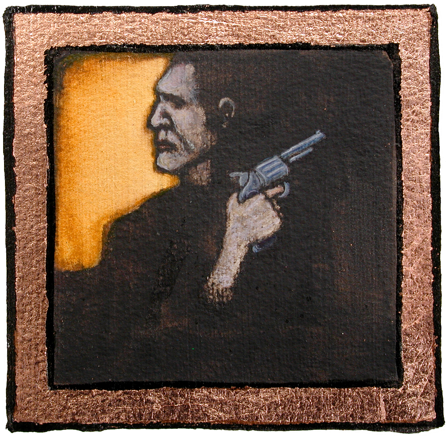 This is another piece from my Outlaws series, titled Two Sides. For some, this is a little scary- a guy holding a gun. For me, it is representative of the two opposing sides in everyone’s nature.