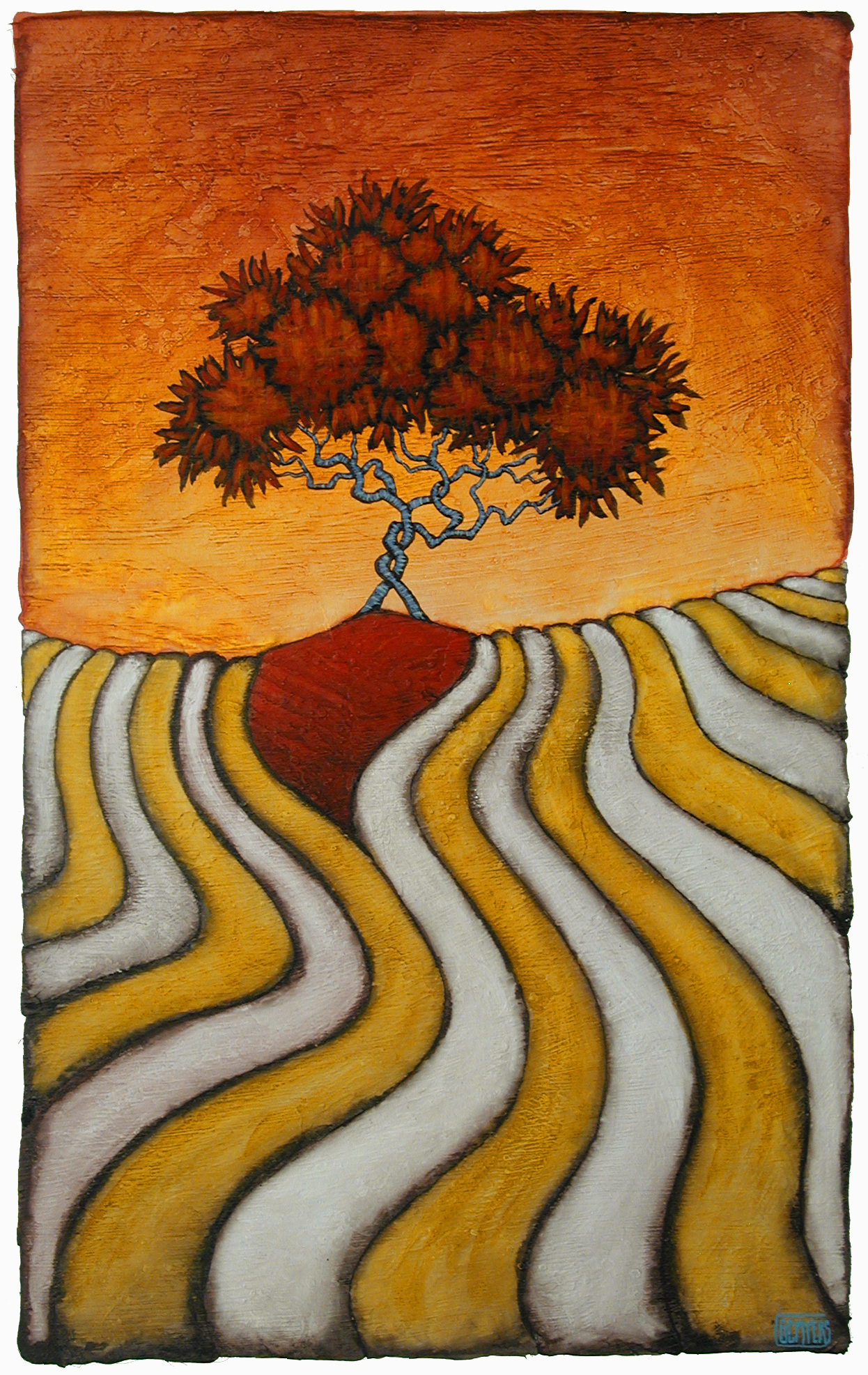 It has some of my favorite icons. It uses the red tree, of course, but it is two entwined trees, something that most see in my paintings as symbolic of love or partnership. It also has the filed rows in the foreground, a symbol for either the value of labor or the flow of time, depending on where the viewer stands in their own life.