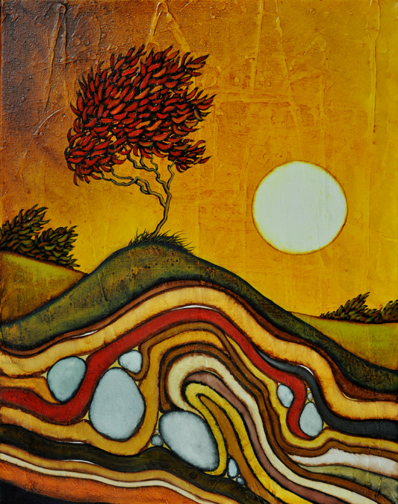 This is a very striking piece, one that demands immediate attention. It has a lot of different aspects that all contribute to the overall impact. It has a very graphic quality in the strong color and the way the multiple layers below stack together. There’s also great visual interest in the sky’s texture, which may not show very well in the image here. The stones below the surface echo the light of the sun (or is it a moon?) in this sky.
