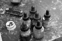 This a photo that Barbara Hall Blumer took of ink bottles on the table where I paint a few years back for her book, In Their Studios, which documented artist studios in the Finger Lakes region. I’ve always liked this simple photo and am showing it to just talk for a bit about one of my favorite materials to use in my work, acrylic inks.