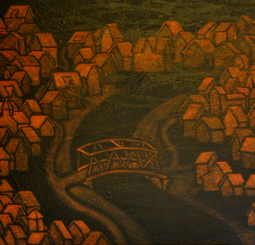 So I’ve been working on this large painting, a 42″ by 60″ canvas, as I noted in Saturday’s post. When I last wrote I had just blocked in the lower parts of both sides and had the bridge just sort of sitting alone in the middle. Since then I have continued with the underpainting in the red oxide that I prefer to use. Most of this is applied in an almost dry brush way, where I put my brush into paint then swab a lot of it off before applying it to the canvas. It leaves a lighter layer of paint, allowing the black underneath come through. It takes a bit longer but it suits the way I see the thing building and growing.
