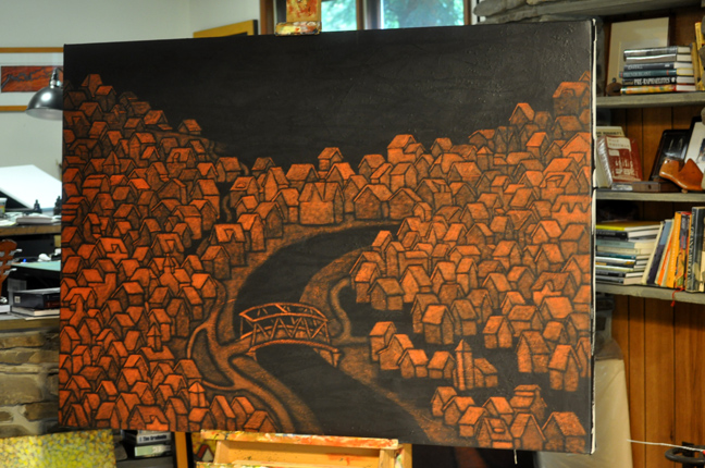 It also takes a lot more time than one might suspect in growing the village from the start, especially in a way that makes it feel organic and not just thrown together. Each new element informs the next and there is a bit of time spent just looking at each piece to make sure that it plays off the form below and beside it. This is even more crucial in such a large canvas because I’m trying to maintain a continuity of form throughout the whole piece so elements in different areas of the canvas still relate to one another.