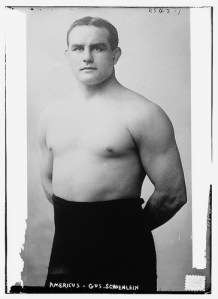 I had heard stories that my grandfather, Frank “Shank” Myers, had lived and participated in this rough and tumble world but had never seen any evidence until I started reading these old papers. But there he was, a 17 year old kid described as an Eastside mat ruffler, rolling around in smoky halls with strangleholds and body throws. In one little notice, he was advertised as the preliminary match for a match headlined by Americus, shown here, who was touring pro who would come into town and take on the best of the locals. It was to be held at a hall in a local hotel that had been remodeled for the event.