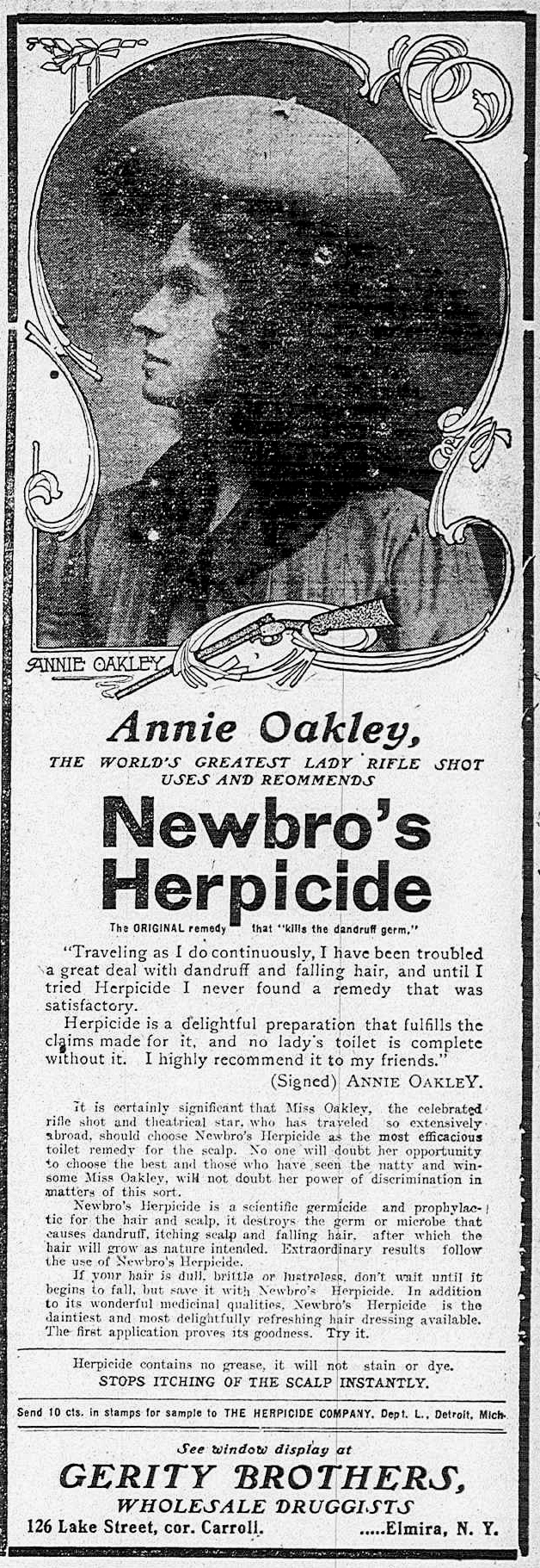 As I mentioned in a post a few days ago, I’ve also been spending a little time looking at old newspapers as I do a little research into a few ancestors. It’s also really interesting to see an article concerning a relative next to an ad of that time, such as the one shown here, with Annie Oakley endorsing a dandruff shampoo. It makes you realize what a transitionary period those early years of the 1900’s were, with so many aspects of rapid progress taking place in a world that had changed much slower for centuries before.