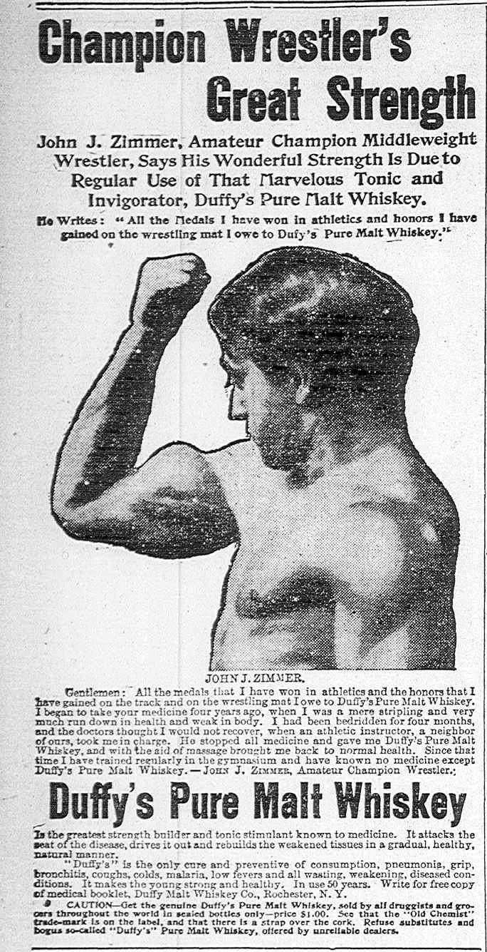 I’ve written about how much I like reading old newspapers, if only to get a kick from the claims of the advertisements of the time. One of my favorites that ran in our local papers was from Duffys Malt Whiskey, which was promoted as a tonic of sorts which built strength and fought disease. Bronchitis, pneumonia , malaria and the maladies of old age were helpless before the smooth taste of Duffys. The wrestler in this ad claims to have risen from his sick bed with just the aid of Duffys.