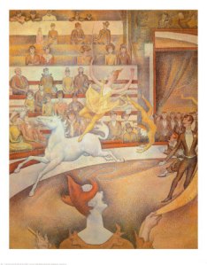 Sunday Afternoon on the Island of La Grande Jatte which is probably remembered by many as Sunday In the Park With George , from the Stephen Sondheim play which revolves around the Seurat painting. For me, the Seurat paintings that spring to mind are a couple of his pieces that revolve around the circus, such as the one at the top of this post, Circus Sideshow.