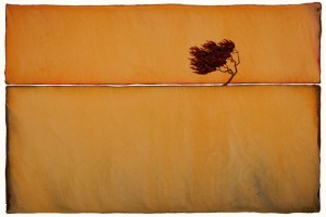 The tree was put in at the last moment. After I had completed the two blocks, I sat this aside for quite awhile, looking at it in the studio, trying to determine if it held together just as it was. Was there enough there — color, texture, contrast– to hold my interest, to make me want to continue looking.