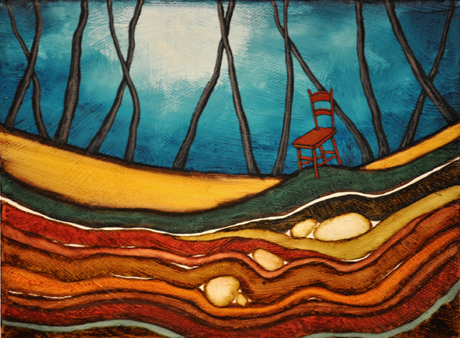The Strata work still exposes the underground timeline but relies on the rhythm and color of the layers to carry the painting. There is also a chair aboveground in this painting, something that I never used in the Archaeology work, which was intentionally left devoid of human evidence outside of the underground artifacts. The inclusion of the chair puts this piece more in the present time, the time of man. The Archaeology series hinted more at being in the future, in a world without man.