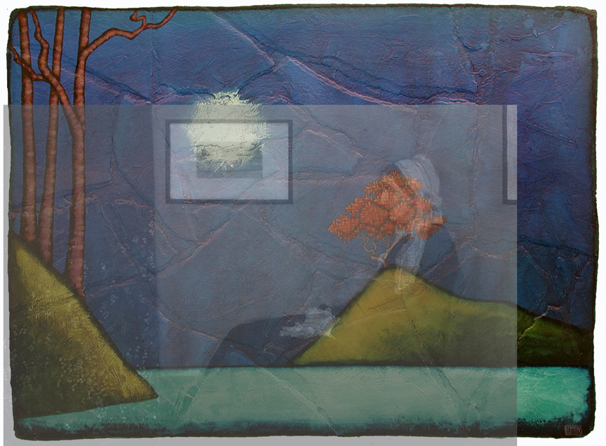 But if you put those differences aside and quickly take in the shape and form of each piece, you can begin to see the similarity. The line of trees on the small mound of land in my piece take the place of Whistler’s dark curtain on the far left. The water in mine becomes the floor of his. The body of his mother is replaced by my island and her head becomes my red tree. The framed print is now my moon.