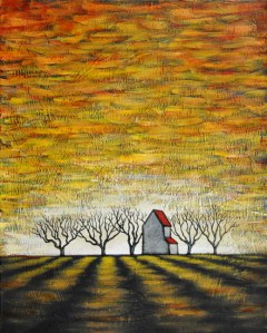 This is a new painting, a 16″ by 2o” canvas. It has a darker feeling than a lot of the recent work and has a much more ominous tone. I think a lot of that comes from the chaotic nature of the sky and the darkness that rises up from between the field rows.