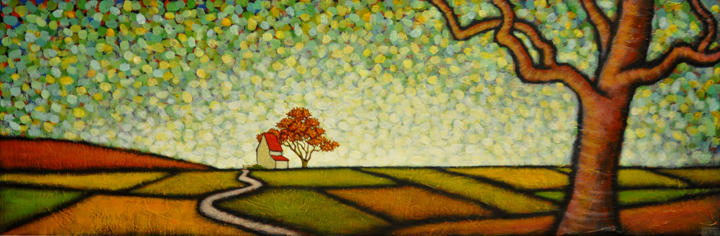 This piece seems to fit that line for me. There’s a festive feel in the colors of the fields and the confetti-like sky but there’s a distant feeling there as well. The dichotomy of a clown.
