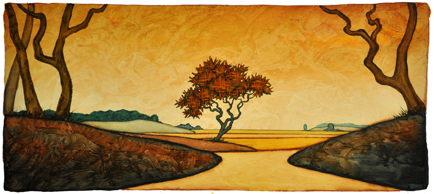 The piece above, In the Golden Light, is part of this show. It is a work on ragboard and measures a little over 11″ by 25” and is matted and presented in a 20″ by 34″ frame. I think it’s a prototypical example of my work, one that strikes close to the core of everything I want to show and say in my work. It’s a painting that flowed out easily and gracefully near the end of the final days of painting for this show, almost as though it were the final performance after months of dress rehearsals. There was no struggle with this piece and there was a sense of a type of destiny in it even as the first section of paint began to dry. I can’t fully explain this. I used the word gracefully earlier in the paragraph and there was a type of grace in the painting of this, an ease of motion and a confidence that I seek yet seldom find, in my work or in my life.