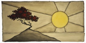 Sometimes a title for a piece is so undeniable that it makes all other attempts at naming it seem utterly futile. When I completed this 8″ by 16″ painting on paper, I tried to find something in it that reminded me of something other than the feeling of Eastern influence that seemed to drip from the surface. The bonsai-like tree and the mound from which it sprouts. The rising sun. Even the way the sky is segmented and shaded seemed to bring forth thought of a flag from the East. It all conspired to give the painting a decidedly Eastern Zen flavor.