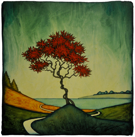 When I had finished this piece and began to search for a title, I focused on the intertwined trees. I’ve often used dance terms to describe the way they seem to hold each in these paintings and this piece definitely had the feel of dance for me. So I began to search for a term that captured this painting.