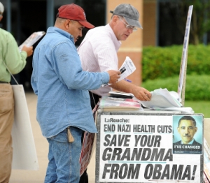 Even now, as I sit here this morning, it is not outrage I feel but a queasy mixture of sadness and worry. Worried that their are so many others like these people out there, waiting rise up, without questioning with their own commone sense, at the call of someone like LaRouche. I had always seen the Obama Hitler poster as idiocyand hate but now see it also as a symbol of exploitation…