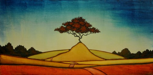 I thought that perhaps adding the tree would do it but seeing the silhouette did nothing to animate the surface. As I built up the layers of color, I still wasn’t feeling it. Then as I put on the final touches that highlighted the edges of the foliage, there was a huge change in the painting. Those final touches gave added depth and in this depth, the whole surface seemed to unite, coming together as one entity. It became alive and vibrant.