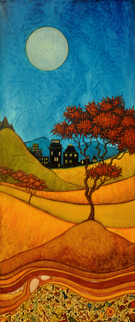 The client had specific requests that had to be addressed. First of all, it needed too be one size, which ended up being an 18″ wide by 42″ high canvas. This size and proportion would dictate how the painting was composed. He wanted it to be part of the Archaeology series as he had uncovered a number of old items in the ground around the old farmhouse he was renovating. But he didn’t want to not have the below-the-surface area overwhelm the painting, desiring a smaller presence for the assorted items. He liked my blue night skies and moons and red trees that were spindly like the pink mimosas in the yard of the old farmhouse. The two red trees furthest away have touches of pink in them.