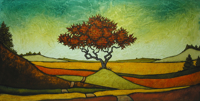 That’s not an easy task to accomplish or even attempt in this world. Perhaps that is why my paintings often deal with a landscape that is not solely of this world. One can step back and analyze them with a cool eye and say that this or that element in the painting doesn’t or couldn’t exist in the real world. An orange field or a bright red tree. But my goal and hope is to make them seem possible in the eyes and minds of the viewers, to create a harmony in the colors, textures and forms of the painting that allows them to comfortably assume the reality of the landscape I’m putting before them. To create a world that opens the mind to this and other possibilities.