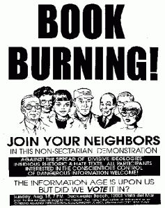 It seems so ridiculous and so counterproductive to the movements who stage these events. Book burning is a trait of the weak and fearful. Burning a book says that you are afraid of the whatever is in that book and don’t feel confident enough in your own beliefs and morals, or those of your children, to simply counter the claims with tolerance and logic. Demonstrate your moral superiority and the strength of your own character by publicly pointing out the flaws and mistruths of the literature in an open forum rather than simply yelling that it is obscene and setting it ablaze. If you can’t counter the books with logic and truth then perhaps you must look at your own thoughts and motives with a bit more care.