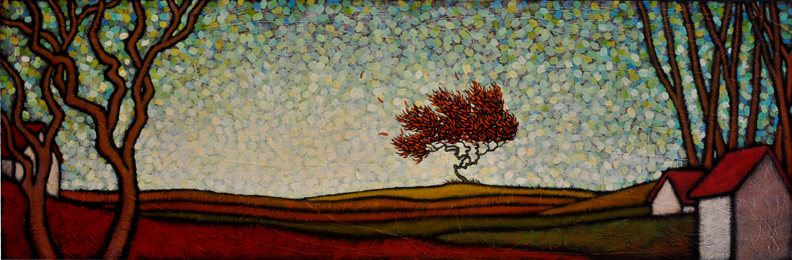 For me, this emotion goes back and forth between joyous, almost triumphantly defiant, and a bit sad, as though the leaves are moments slipping away, opportunites lost. Perhaps it is both. Whatever the case, I find myself liking this piece a lot, looking at it quite often as it sits over the fireplace in the studio. Now to find a title…