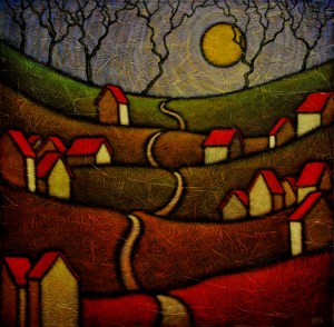 Now, maybe this will not fit into the marketplace for my work but that doesn’t matter. When I look at this piece, that is the last thing in my mind. I am immediately pulled into the picture plane and upward, over the knolls, toward the top of the rise where the sun/moon hovers, urging me to continue climbing. It is complete and has its own life, its own momentum. It is what it is and that is beyond me now.