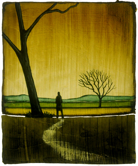 This is a small painting on paper, only 4″ by 5″, that I immediately began calling Uncharted as soon as the final stroke fell into place. The way the path ends at the edge of the field in the foreground and the way the central figure stood there brought to mind someone coming to a point in their life, their journey, who realizes they are at a point and place they have never encountered before nor even been warned of by others. They want to move forward, they know they must move ahead but they are filled with fears and doubts. Second guessing.