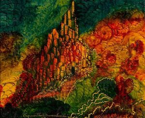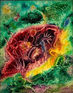 I knew that I desired that the composition of the painting to be uncomplicated , even simple. I wanted the chaotic feel of the texture underneath to be able to shine through and carry the weight of the piece’s message. But, at the same time, the overpainting needed to be strong enough to not be overwhelmed by the underneath. I felt that the blowing red tree offered that strength as well as a reactive counterpoint to the fury of the sky. It was painted as a dark silhouette to move it further to the front and create space behind, space that carries the emotional feel of this piece.