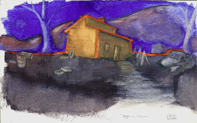Looking through some old work, most of which was done early on while I was still forming my technique and style and before I showed my work publicly, I came across this oddity that I noted as Hogback Heaven. It’s a goofy little scene of a rough hewn home and yard somewhere out on a back country road, the kind of place that I often passed years ago in my treks on the backroads around my home area. All that is missing here from my memories of those places are a barking hound and a toddler in a sagging diaper playing in the gravel of the driveway.