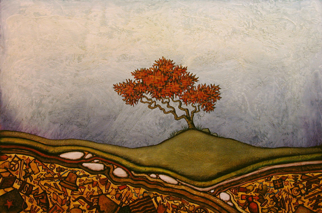 There is so much I like about this painting from the moody duskiness of the sky with its purples that grade downward to the way the underground boulders create a visually rhythmic counterpoint. But the thing that always stuck out for me was how the underground debris came together to form a narrative, which is where the title originated. There was no intent in painting this. All of the debris was painted in a freestyle manner, with each piece being painted independently from one another outside of possible relationships in size and shape. It wasn’t until it was done that I began to see a stroyline running through the heap of items.