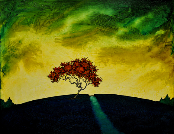Omega is the last letter of the Greek alphabet and is often used to designate an end or a finish, which fits in with the idea of it being the last piece of 2011. But there is also an ominous, serious quality in the sky that portends that the omega may mean more than that. Perhaps this last little uphill rise is the final part of a journey but not necessarily in an end of life sort of way. Perhaps the dark blue of the rise signifies a past of some sort and the rise lifts the viewer out of that darkness and into the brightness of some new enlightenment. The tree seems to be near a cusp between the contrast of dark and light, close to the discovery of what is over this rise. There is definitely some sort of epiphany beyond it.