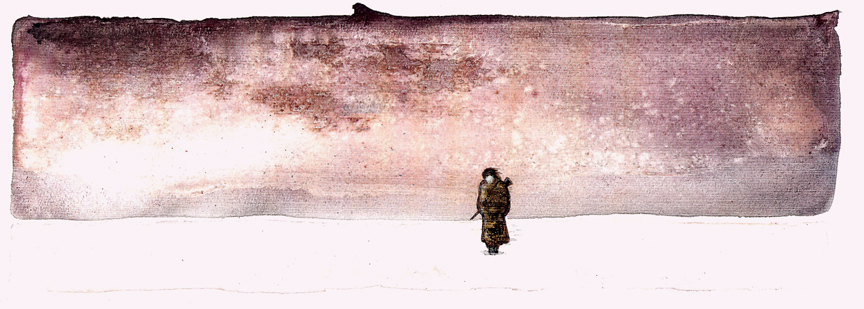 I particularly like the barren feel of the snowy plain and the way the sky dominates and sets the emotional tone of the piece, its red tones set against the cold setting in a way that makes the moment seem large as the figure trudges slowly forward. The rifle slung over his shoulder with the gun barrel down gives it an ominous sense, as though this figure was returning from battle or returning empty-handed from a hunt for sustenance. The moment just seems to loom large in this piece.