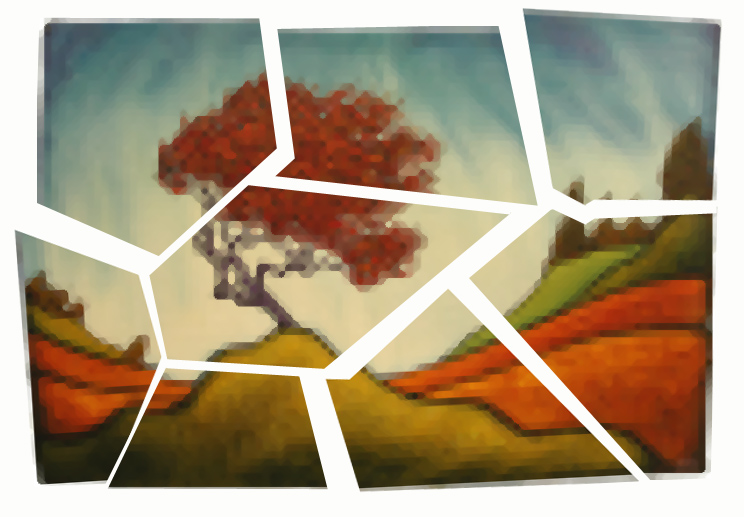 The title of this painting comes from the way the sky is formed from many patches of color and the way the light is formed therein. It reminded me of one of the supposed byproducts of the string theory which is a very speculative area of quantum physics. Without going into the scientific basis for the theory ( which I really couldn’t do very well anyway), string theory basically creates a platform where extra dimensions could and may exist alongside the dimensions that we know and dwell within, without our knowledge of their existence. A simplified example of how this might work is the way we are surrounded by radio signals all the time without our knowledge but with the proper receptor, a radio, they become apparent. With string theory, perhaps there are also parallel dimensions around us without our knowledge, dimensions that contain others forms of energy, other forms of existence.