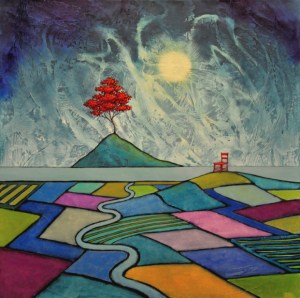 That being said, this painting is a pretty interesting one from a visual aspect. It has great contrasts, texture and bright yet subtle colors that make it an eye-catcher. For me, the painting’s strength is in the stability of the triangle formed by the Red Tree, the Red Chair and the moon. It really gives the whole piece a feeling of sturdiness and assurance, at least in my eyes. This sturdiness is supported by the solidness of the patchwork fields on which the triangle sits and plays off.