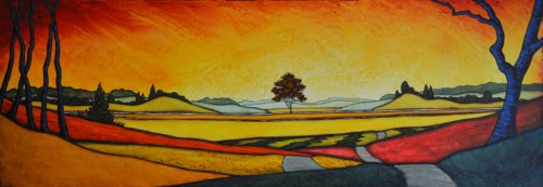 The feature of this piece that stands out for me is the small round lake that is the focal point here. I made it appear as thought the viewer was looking directly down on it which gives it a round , flat appearance on the canvas. There was just something that I liked in the way the lake appeared this way. It reminded me of the eye from a peacock’s tail feathers and I liked that shape and color contrasted with the lines and warmth of the rest of the painting.