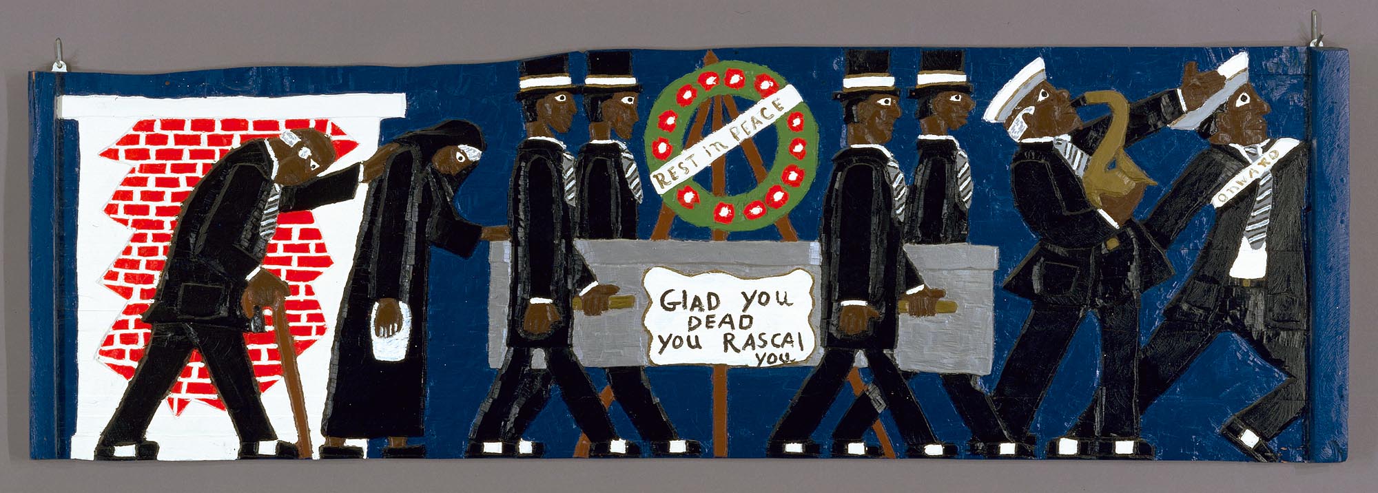 I recently stumbled across the work of Herbert Singleton , a New Orleans folk artist who made wonderful and colorful carvings such as the piece at the top, Glad You Dead You Rascal You, which depicts a New Orleans funeral procession. Singleton’s life story is similar in may ways with other folk artists– a life filled with missteps and violence, run ins with the law and addictions. He spent the better part of 14 years in prison and died in 2007 from lung cancer at the age of 62. But in his short time here, Singleton created a powerful body of carved work that documented his world and goes well beyond the label of folk art or self-taught art. It is not benign work . It often rails against social injustice and hypocrisy with great gusto.