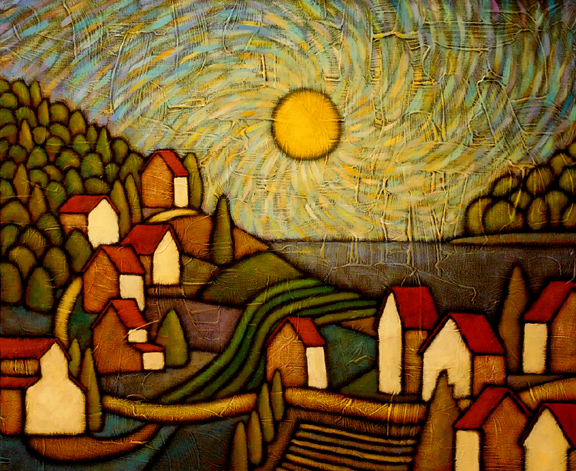 There was one piece that was partially done, the composition completed in red oxide as was the sky, a swirl of many colors around an eye-like sun (or is it a moon?) One of the things I wanted to do with this piece was to pass it around the class and allow the kids to get a better sense of the tactile nature of it. I wanted them to be able to run their hands over it, to let the texture of the surface register on their hands. This gives you a different sense of the work, no longer feeling like a distant scene but more like an object to hold. Just looking at art from a different perspective sometimes changes our perceptions of it.