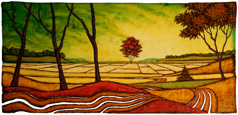 I’ve been finishing this piece over the last few days and it has underwent a dramatic transformation during the last stages, one that took it from a piece that was struggling to find its identity to one that has what I feel is a powerful presence. When I look at it I see the bands in the field that run towards the center as being not only a crop but as a representation of some sort of communal knowledge or power that runs through our world, unseen. The Red Tree stands at the center, joining this gathering knowledge with the greater power of the universe that I see represented here by the open horizon behind it. There is an ethereal quality in the descending hills, one that gives a feeling of movement through time especially when coupled with the breaking sky. The Red Tree is the new revelator here, exposing the hidden powers of the universe to those who want to see.
