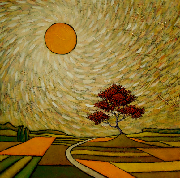 One of the pieces that I will be framing is this new one, an 18″ by 18″ canvas that I am calling The Empowerment. I get the title from the sun and its relationship with the Red Tree, which draws strength from the rhythmic swirl of the sunlight showering down on it. We all draw strength from something, be it light of the sun or warmth of our loved ones, that allows us to walk our own paths. For me, that’s the basic theme of this painting which is strengthened itself by what I perceive as an interesting mix of warmth and coolness, feeling both warmly embracing and airily cool in its openness.
