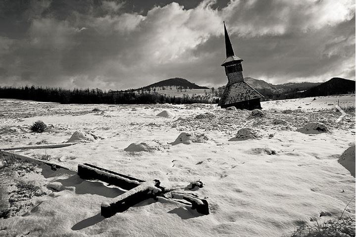 sapanta-peri-monastery-02-gateWhile looking at some other images of this monastery, I came across these images below that captured my imagination.  One is a winter scene of a destroyed church.  I don’t have any info on the story behind this but it is an intriguing photo.  The other is of haystacks in the field.  They stack the hay on poles which creates these slender, almost human-like shapes, that seem to be marching across the fields. Fittingly, the Romanians call them Germans.  I kind of think they look like the Shmoos from the old Li’l Abner comics.