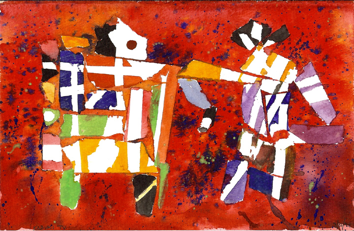 GC Myers Kabuki TV 1994Whenever I come across this little experiment from back in 1994, I linger over it for a few minutes and smile a little.  There’s a lot going on with plenty of bright colors and sharp angles but with a narrative element within it where I saw a person watching a Kabuki performance on their television.  But more than that I am reminded of the decision to move away from this experiment and continue in the direction that eventually led me here.