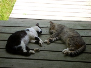 The next morning when I put out some food for them, they both emerged together. They were a mess with bloody cuts and scrapes on both but still wouldn’t let us get too near. Yet they were together now with not a hint of malice between them. From that time on they were inseparable. They spent that very,very cold winter sleeping together in a crude catbed I had built for them, one on top of the other. When they would walk through the yard or up our walkway, they would walk in step with their shoulders shoved together as though they were joined at the shoulder. As spring and summer came, they would lazily sleep on our walkway, often spooning as they laid together with their legs wrapped around each other or would sleep facing one another, their paws lightly touching. When our female cat, Tinker, was outside, Partner would make attempts to be friendly but Ben wanted no part of her and, in an obviously jealous act, would aggressively push himself between the two. It was an amazing transformation from their previous animosity to this sweet friendship.
