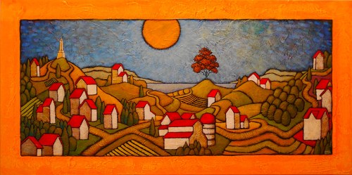 The Carlos Castaneda quote above just reached out to me when I was looking at this piece. The Red Tree here seems to be standing at the edge of the known, the terrestrial world that is defined here with earthy color, solid forms, and dark lines– the lineal universe. Beyond it the non-lineal universe beckons, represented by a nebulous sky and a sun that acts as an unblinking eye.