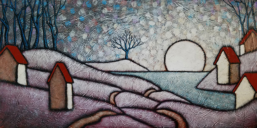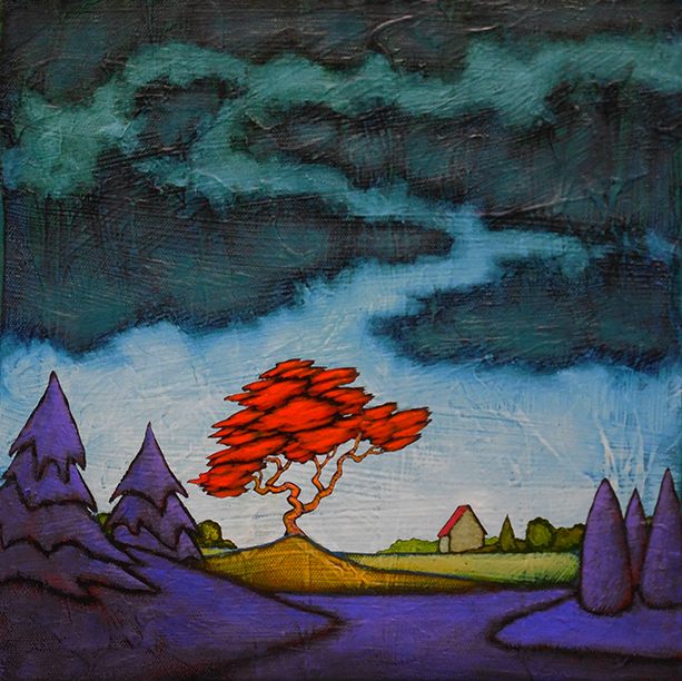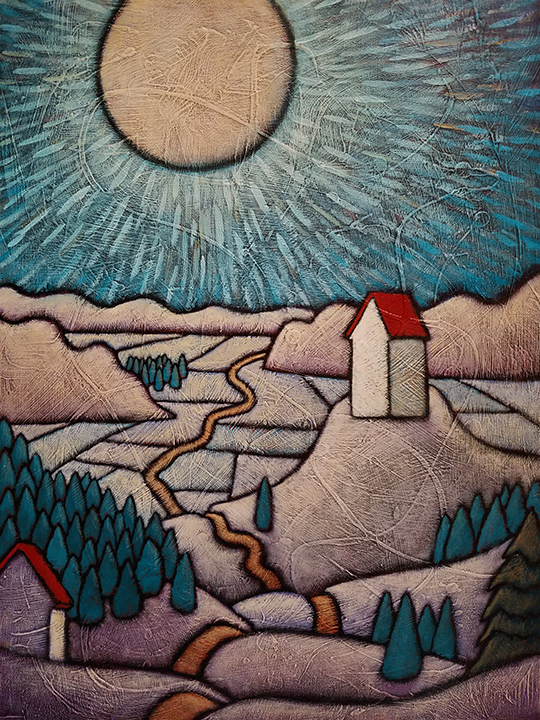And that is how I look at this piece and the central tree. It stands strong and with an air of ageless wisdom, creating a band of light between the darkness of the earthly dwellings and that of the foreboding sky. As Hesse wrote above, like the most penetrating preacher.