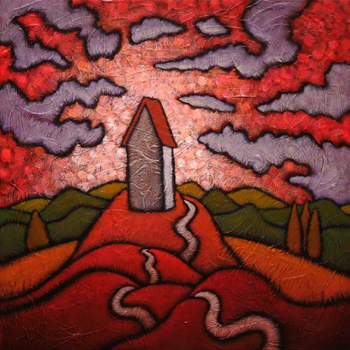 I think the words above from the late journalist Norman Cousins capture what I feel the representative Red Roof house is rising above in this painting. It is a constant battle for us humans to hold on to those things– genuine feeling,inspired response and an empathy with the pain or glory of others– as we live our lives on this planet. We sometimes become self-centered and guarded in our response to many things and emotionally distant in our dealings with others. Instead of feeling their pain or glory, we sometimes experience envy at their successes and a pang of relief that their failures are not ours.
