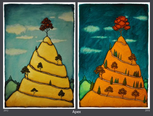 The painting, Apex, as shown above on the left had been bouncing around galleries for quite a few years. It was one of those pieces that kind of gnawed at me after awhile. There was so much that I liked about it and it felt complete yet I began to feel that something was lacking.