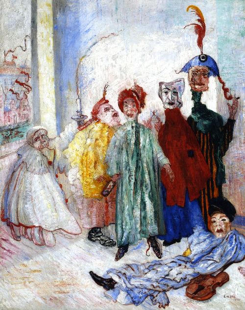 I turn for a bit of advice from art history going back to James Ensor (1860-1949), who I featured here a few years back with a post about his famed painting Christ’s Entry into Brussels in 1889. Ensor was well known for his paintings featuring groups people wearing contorted and strange, even grotesque, masks. Many were based on the masks seen at the carnivals and festivals of the time in his native Belgium. But seen out of context, they were pretty controversial, as you might imagine, in the late 1800’s, given the subject matter and the rough method of much of his painting. This was around the time that the work of the Impressionists was still considered scandalous so you can imagine how the image of a soldier with a skull for a face embracing a maiden with a gigantic nose mask might play.
